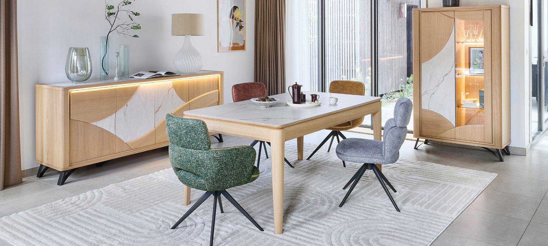 Meubles panneaux de fibres moyenne densité revêtus de placage chêne avec incrustation céramique beige veinée. Pieds fer finition époxy gris anthracite. Eclairage leds sous plateau avec interrupteur « touch » pour l’enfilade. Portes système push. Céramique beige veinée sur la façade et le plateau de l’enfilade. Uniquement sur la façade pour la vitrine.